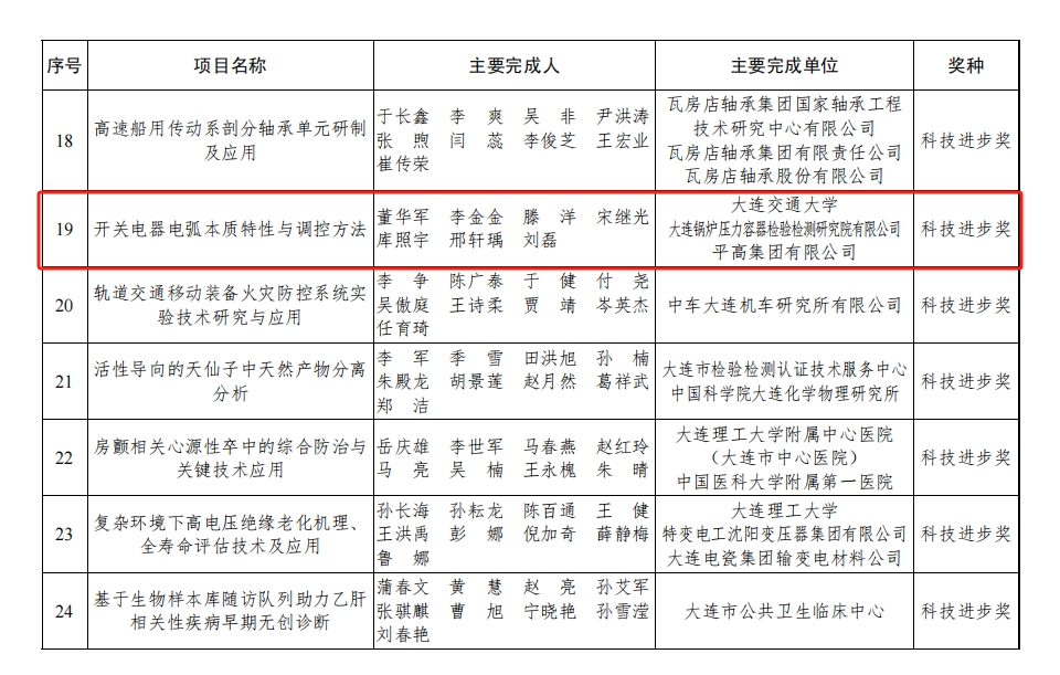 院长董华军带领的研究团队凭借“开关电器电弧本质特性与调控方法”项目荣获 2024 年度大连市科学技术奖-科技进步二等奖。